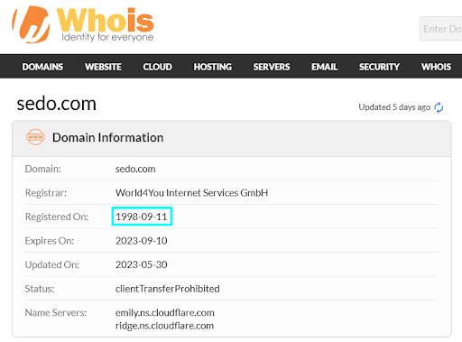 Here's an example of a Whois lookup for Sedo.com showing its registration date